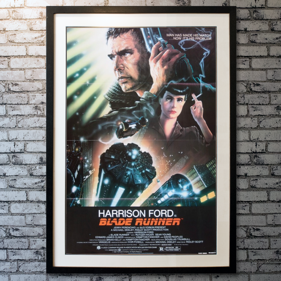 An exceptionally rare first printing One Sheet for Ridley Scott’s Blade Runner, one of the most influential science fiction films ever made. Starring Harrison Ford, Sean Young, and Rutger Hauer, the film redefined the genre with its dystopian vision, noir aesthetic, and philosophical depth.