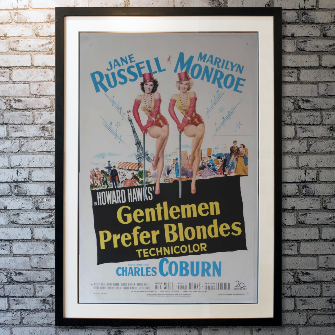 An outstanding original release poster for Howard Hawks’ Gentlemen Prefer Blondes, starring Marilyn Monroe and Jane Russell as showgirls Lorelei Lee and Dorothy Shaw “Two Little Girls from Little Rock” bound for Paris on a transatlantic cruise. A sparkling Technicolor musical, the film blends comedy, romance, and show-stopping numbers, most famously Monroe’s iconic performance of “Diamonds Are a Girl’s Best Friend.”