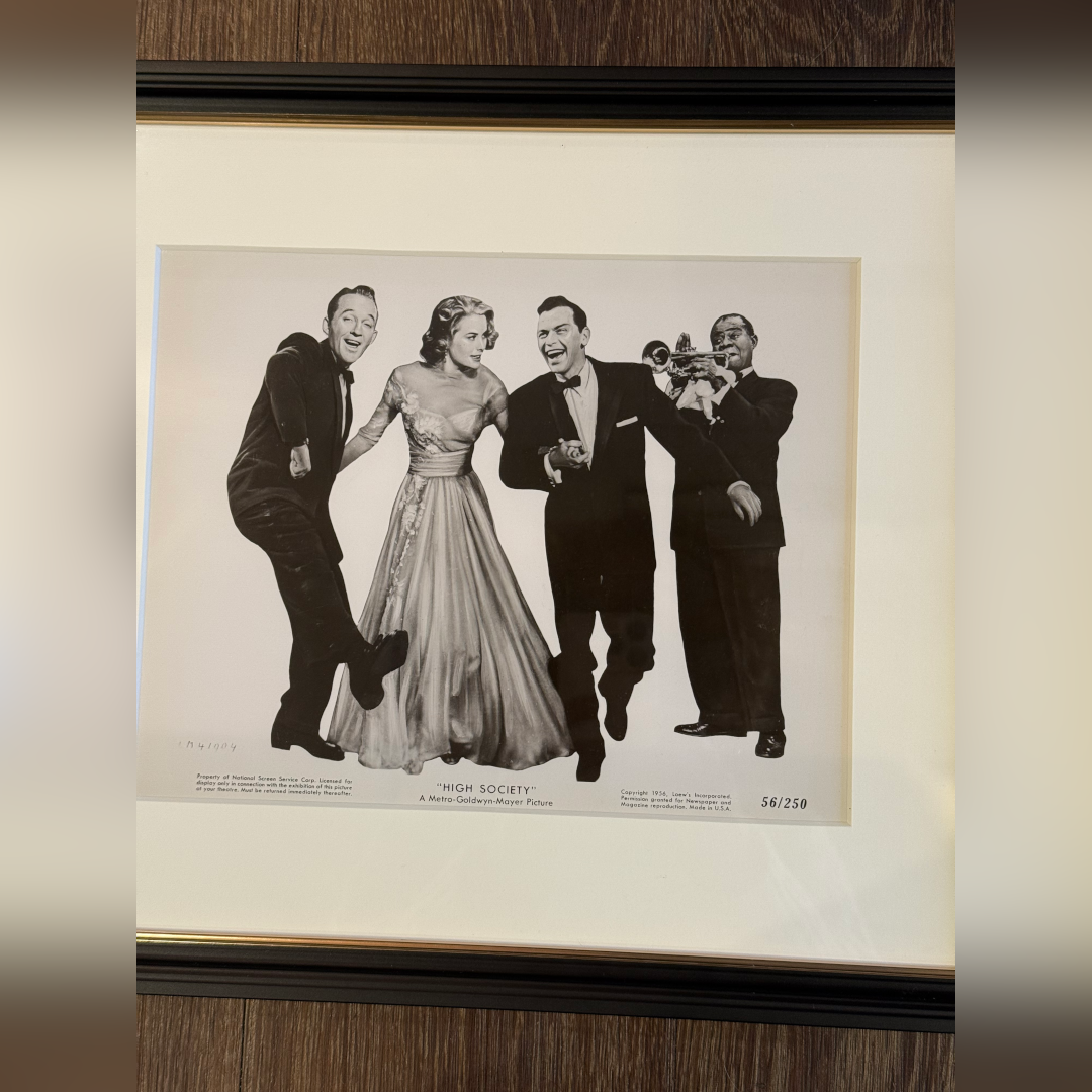A glamorous original MGM b&w publicity still from High Society (1956), the elegant MGM musical starring Grace Kelly, Bing Crosby, Frank Sinatra, and Louis Armstrong. This charming image captures the film’s spirit of sophistication and fun. Crosby, Kelly, and Sinatra mid-dance, while Armstrong, trumpet in hand, plays alongside them. It’s a perfect embodiment of the film’s dazzling blend of high style, musical brilliance, and Hollywood charm.