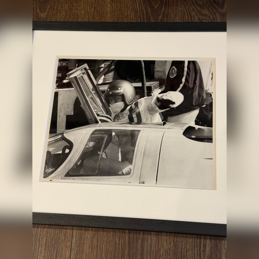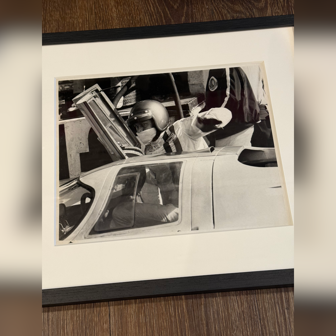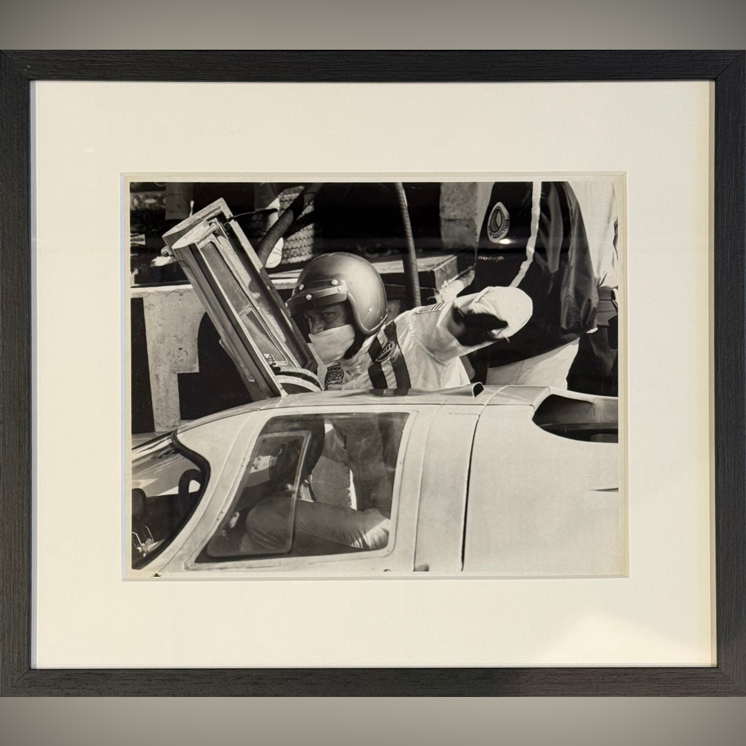 A dynamic and authentic 1971 original production still capturing Steve McQueen in a candid moment as he climbs out of his race car during a pit stop. This image showcases McQueen in full racing gear—helmet, gloves, and suit—embodying the intense realism that defined the film.