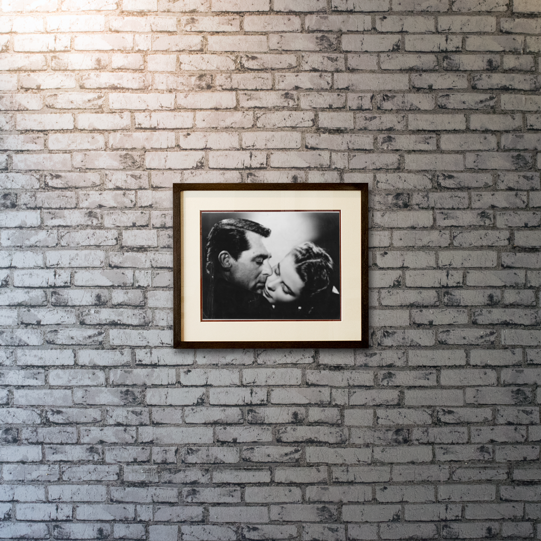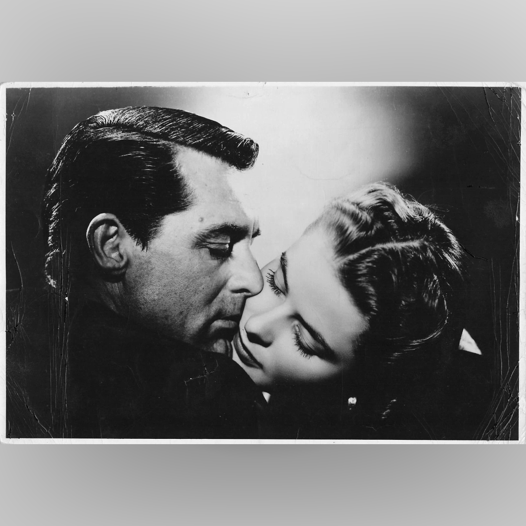 An exceptionally beautiful original 1946 still from Alfred Hitchcock’s Notorious, featuring Cary Grant and Ingrid Bergman in one of cinema’s most iconic embraces. Their faces are caught in an intense moment of closeness — part passion, part peril — encapsulating the film’s central conflict between love, loyalty, and espionage.
