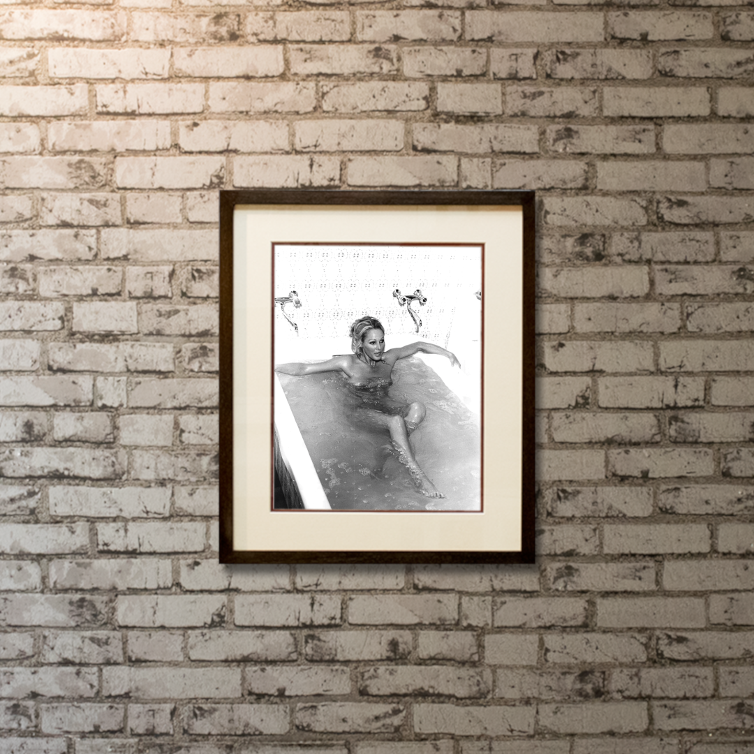 Original 1970 black-and-white Publicity Still from Perfect Friday, featuring Ursula Andress in a memorable bath scene. The composition balances intimacy and elegance: soft water ripples contrast with sculptural lines of the bath and tiled wall, while dramatic lighting accentuates expressive features and classic Hollywood styling.