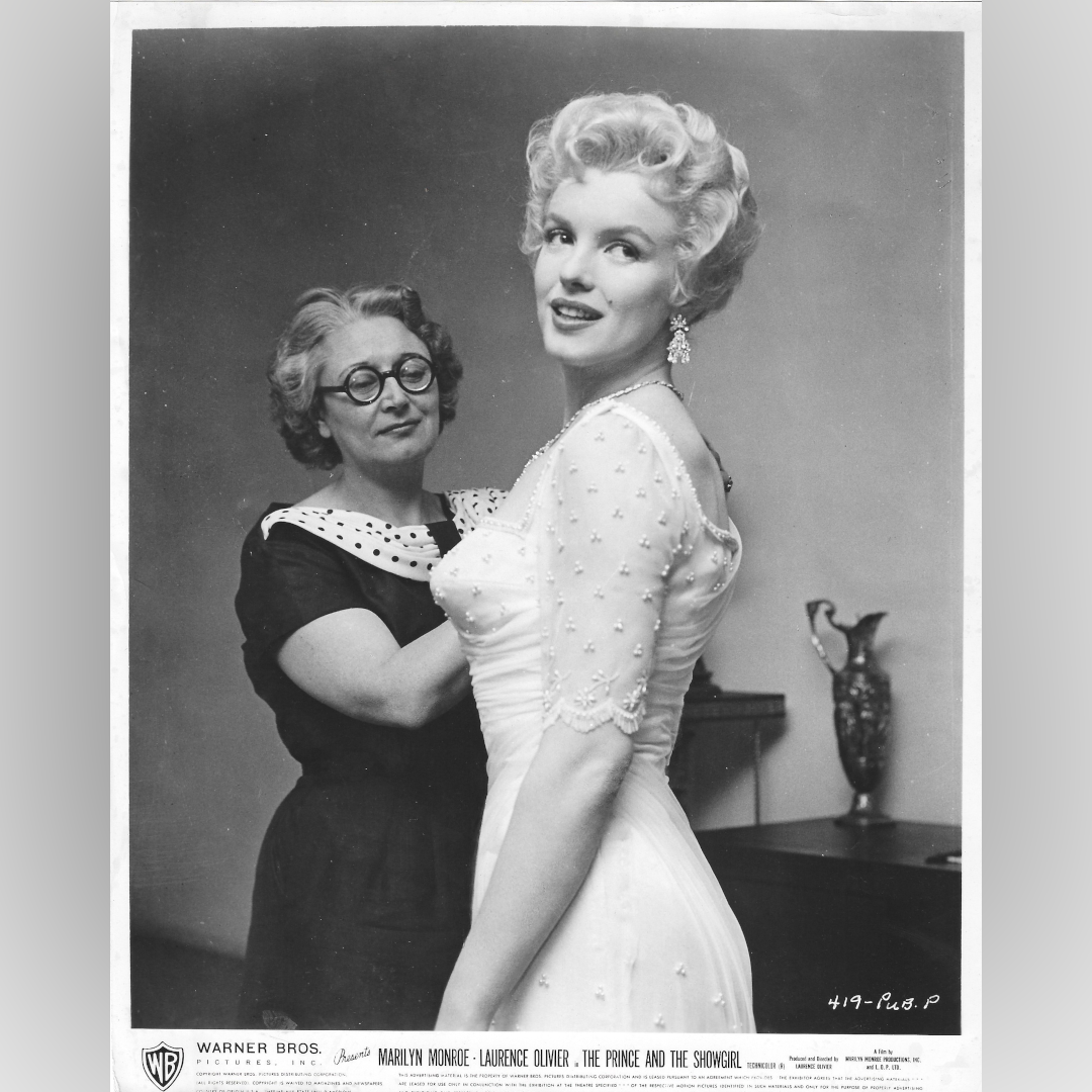 A beautiful and rare original Warner Bros. b&w publicity still, featuring Marilyn Monroe being fitted for her costume on the set of The Prince and the Showgirl. Monroe is captured in a candid yet poised moment, exuding her trademark charm and radiance. This behind-the-scenes image offers a glimpse into the production process and the creation of one of her most elegant screen roles.