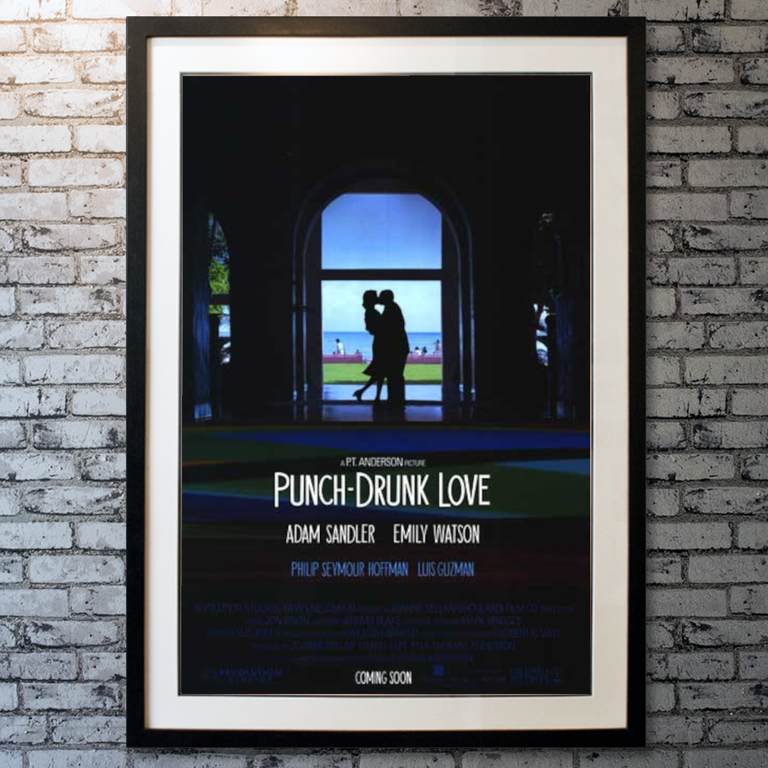 Released in the anxious calm of early-2000s America, Punch-Drunk Love turned romantic comedy inside out—Paul Thomas Anderson’s tender, volatile answer to a culture obsessed with irony. This advance one-sheet captures that contradiction perfectly: a silhouette of intimacy framed by a deep, geometric void, the ocean beyond promising escape but never quite peace.