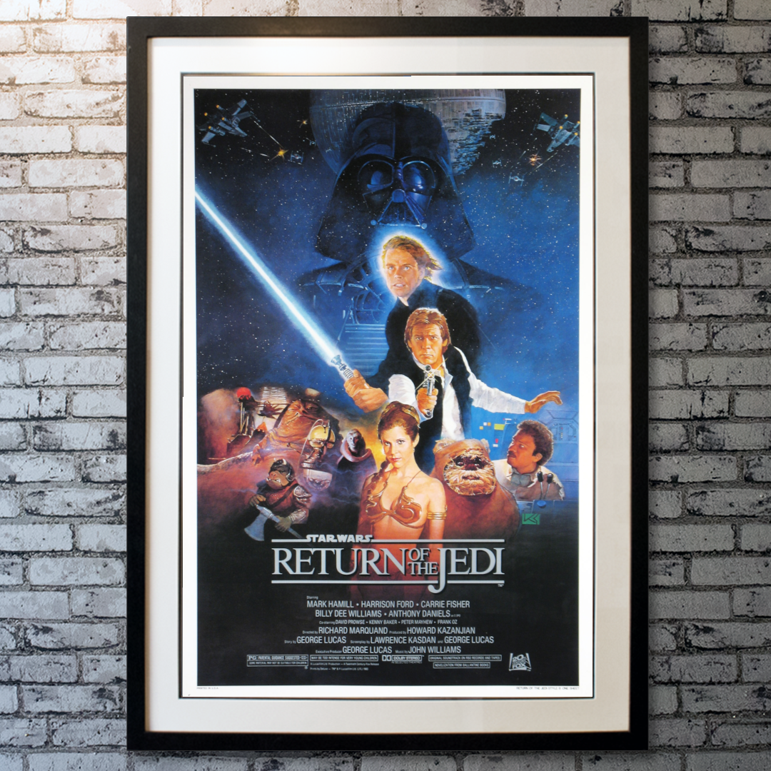 Original US One Sheet poster for Star Wars: Return of the Jedi (1983), the climactic finale of George Lucas’s original trilogy. The striking artwork features Luke Skywalker, Han Solo, Princess Leia in her iconic slave costume, and Darth Vader looming in the background, with the Death Star and space battle completing the composition.