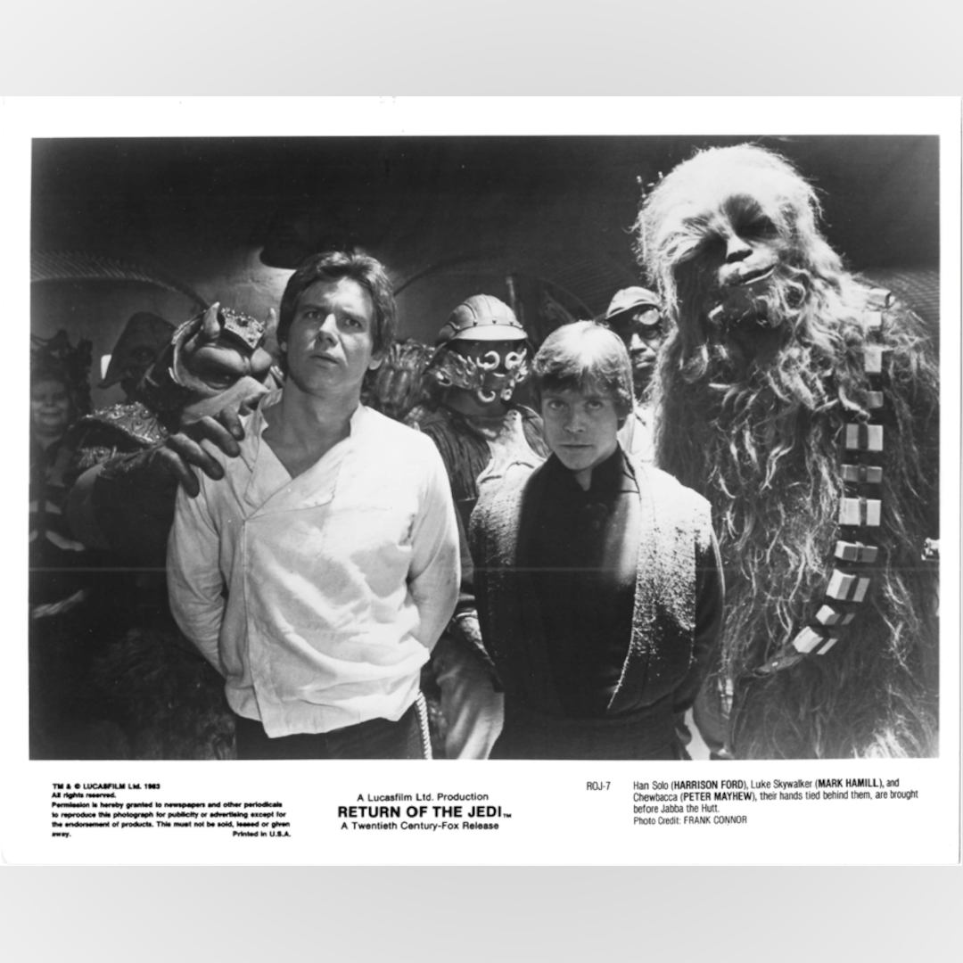 This still encapsulates the darker, more operatic tone of Return of the Jedi, where wit and heroism are tested against mortal peril. As the concluding chapter of the original Star Wars trilogy, the film brought mythic arcs of friendship, redemption, and sacrifice to a resonant close. Moments like this signalled a turning point, from captivity to uprising, before the saga erupts into defiance and triumph. Rich with character and atmosphere, this publicity still stands as an iconic snapshot of one of cinema’s most enduring fantasy adventures and the heroes who defined a generation.