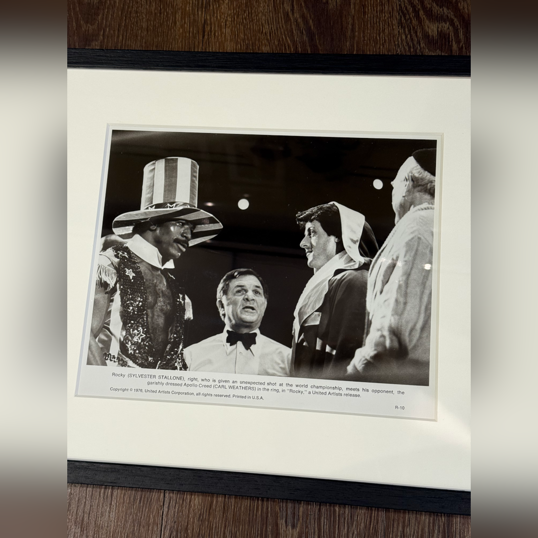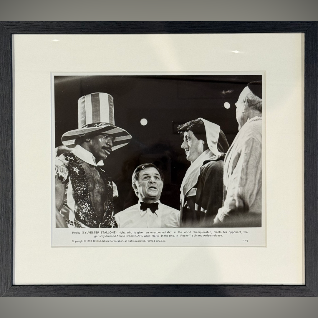 An iconic still from Rocky (1976), capturing the moment in the ring when Rocky Balboa (Sylvester Stallone), the unknown underdog, faces off against the flamboyant Apollo Creed (Carl Weathers). The referee stands between them as tension builds before one of cinema’s most legendary bouts.