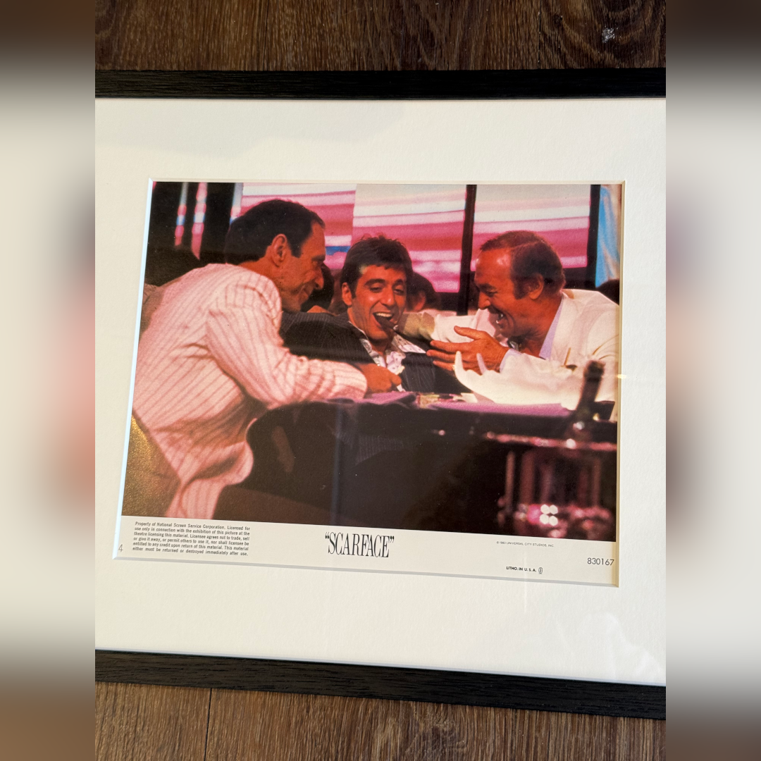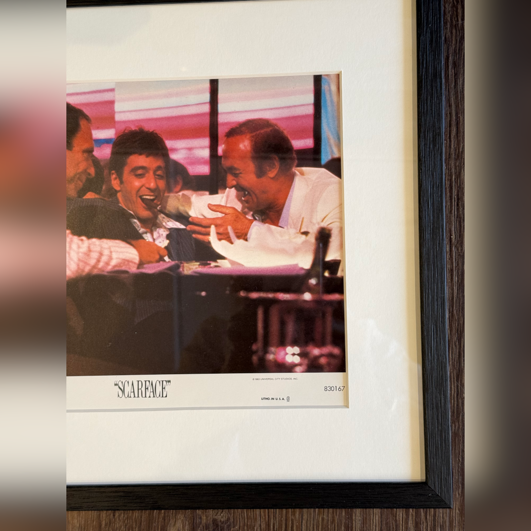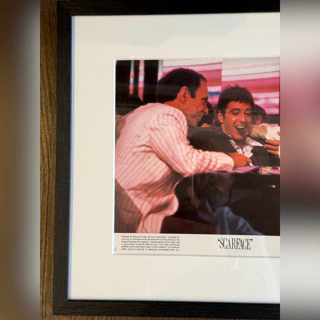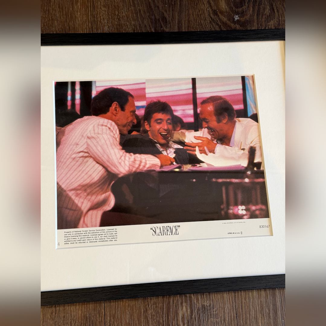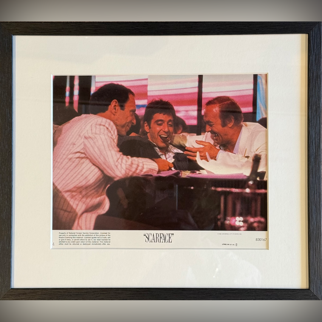 This card would have been used in a cinema foyer in the USA when the film first came out. Brian De Palma’s "Scarface" has become a cultural phenomenon and original lobby cards are highly sought after by collectors. This original U.S lobby card features a classic scene of Tony Montana (Al Pacino) laughing with friends, offering a rare glimpse of camaraderie before the descent into violence.