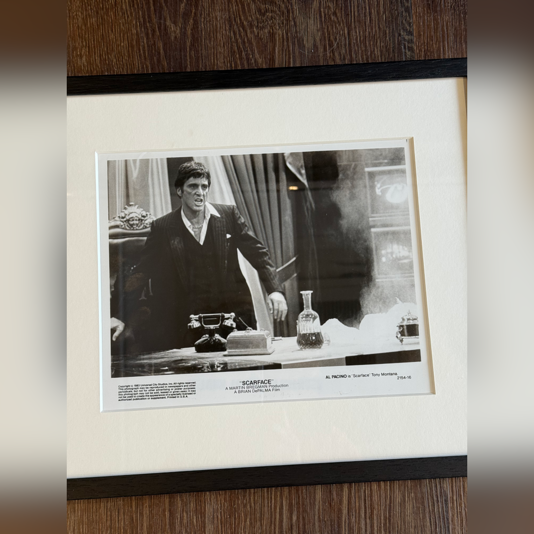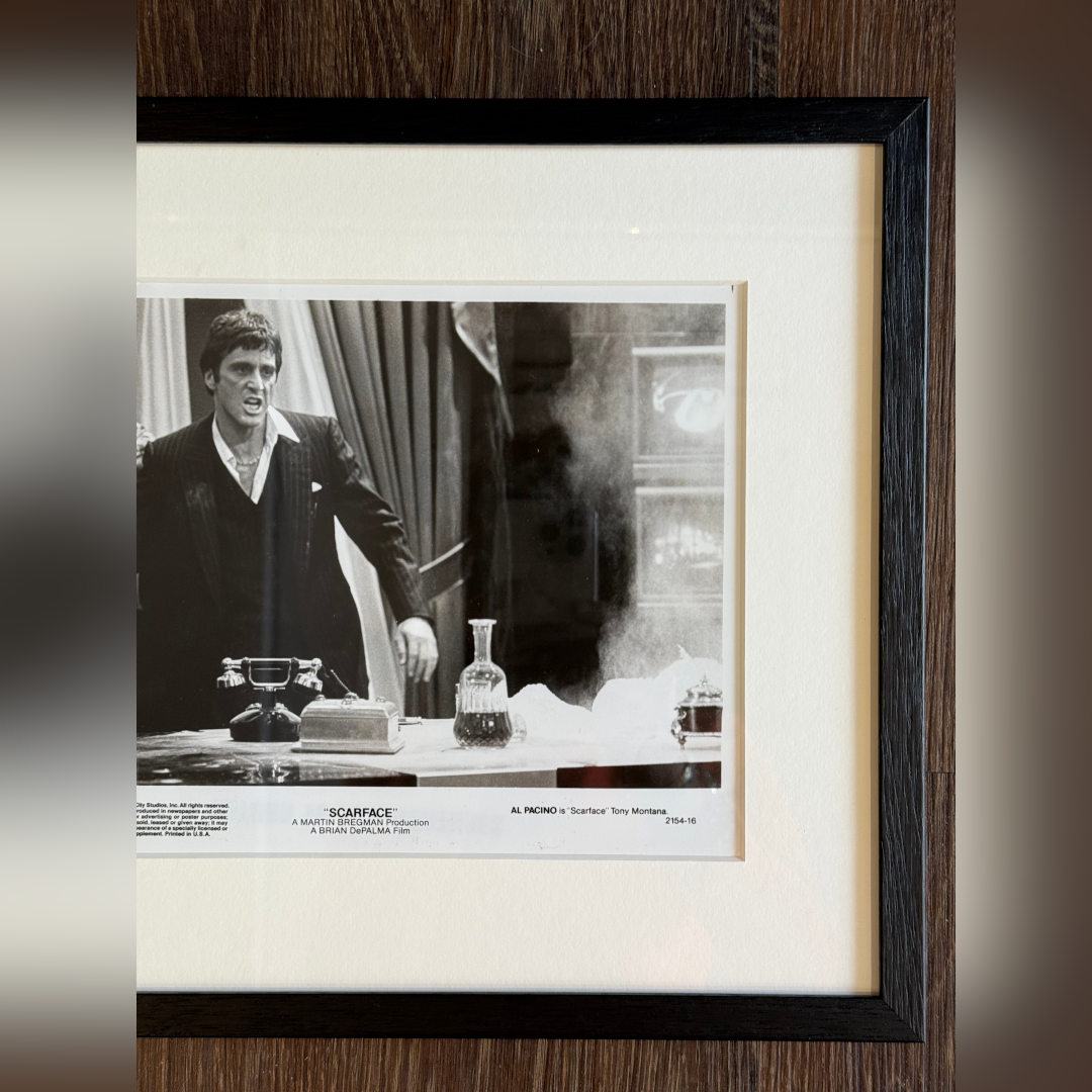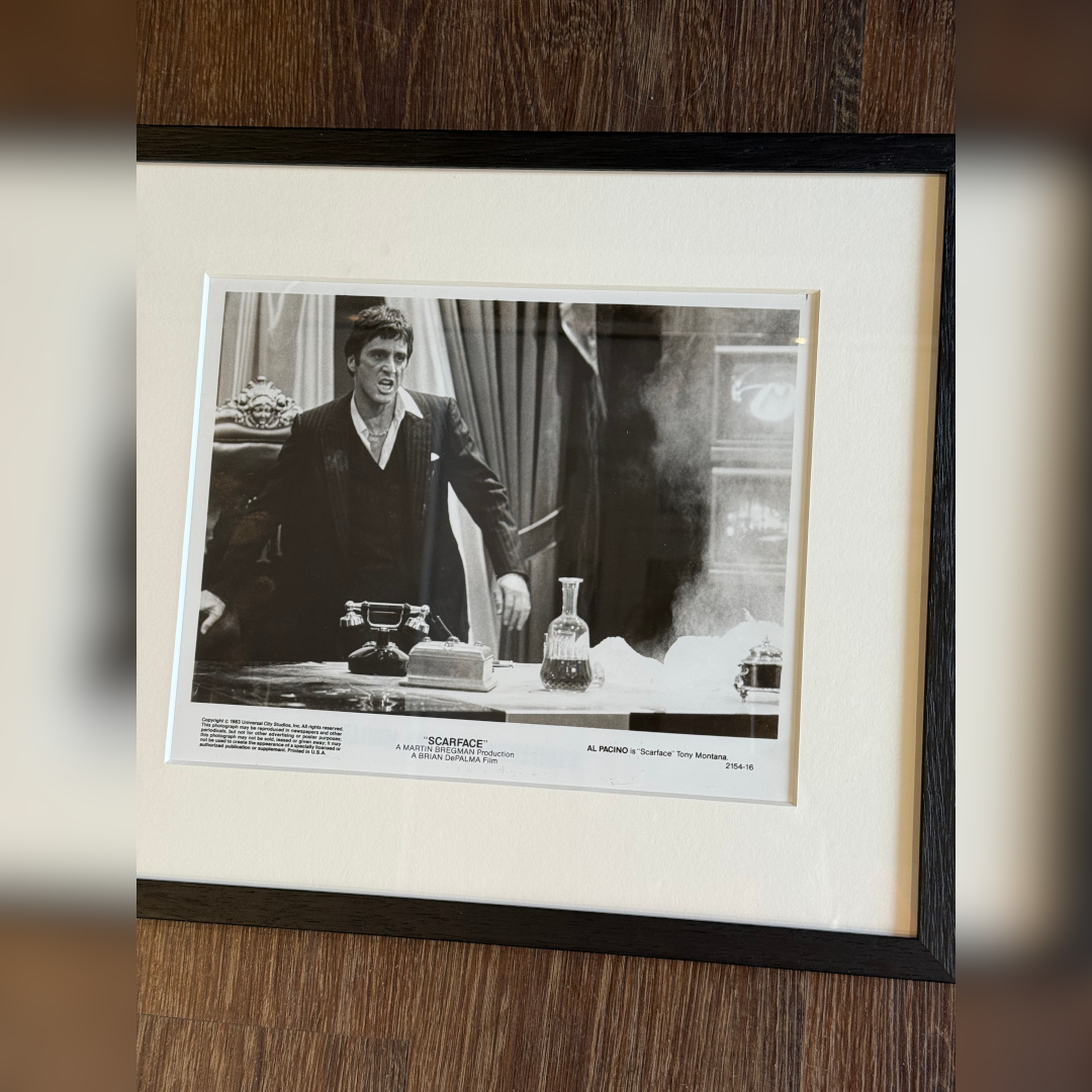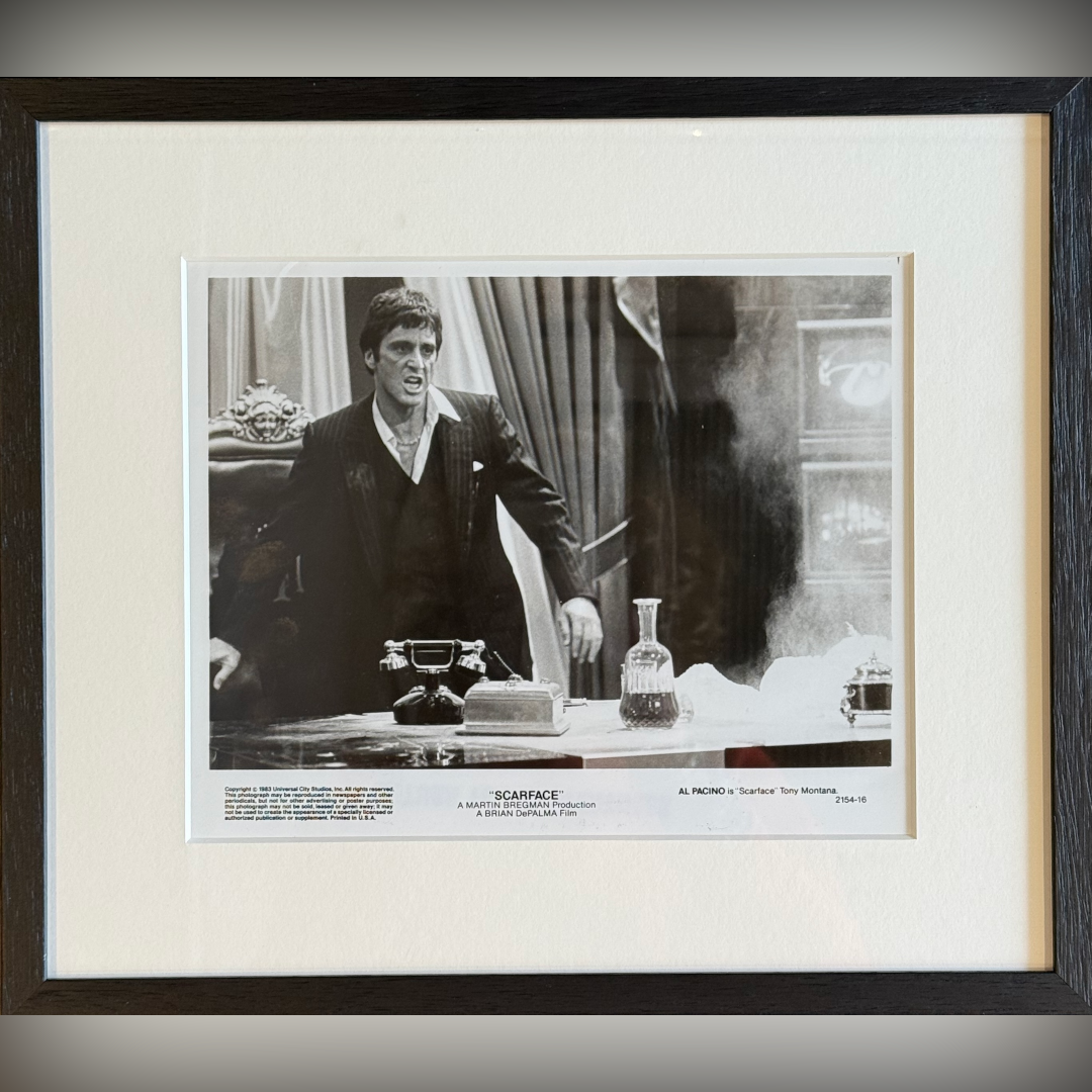 This powerful original still from Brian De Palma’s Scarface captures Al Pacino in one of the most iconic scenes in cinema history—Tony Montana, arms spread, high on power and paranoia, moments before his explosive downfall. Issued by Universal Pictures in 1983 for theatrical promotion, it’s stamped and captioned, featuring the original type-set credit block and image number (#2154-16).