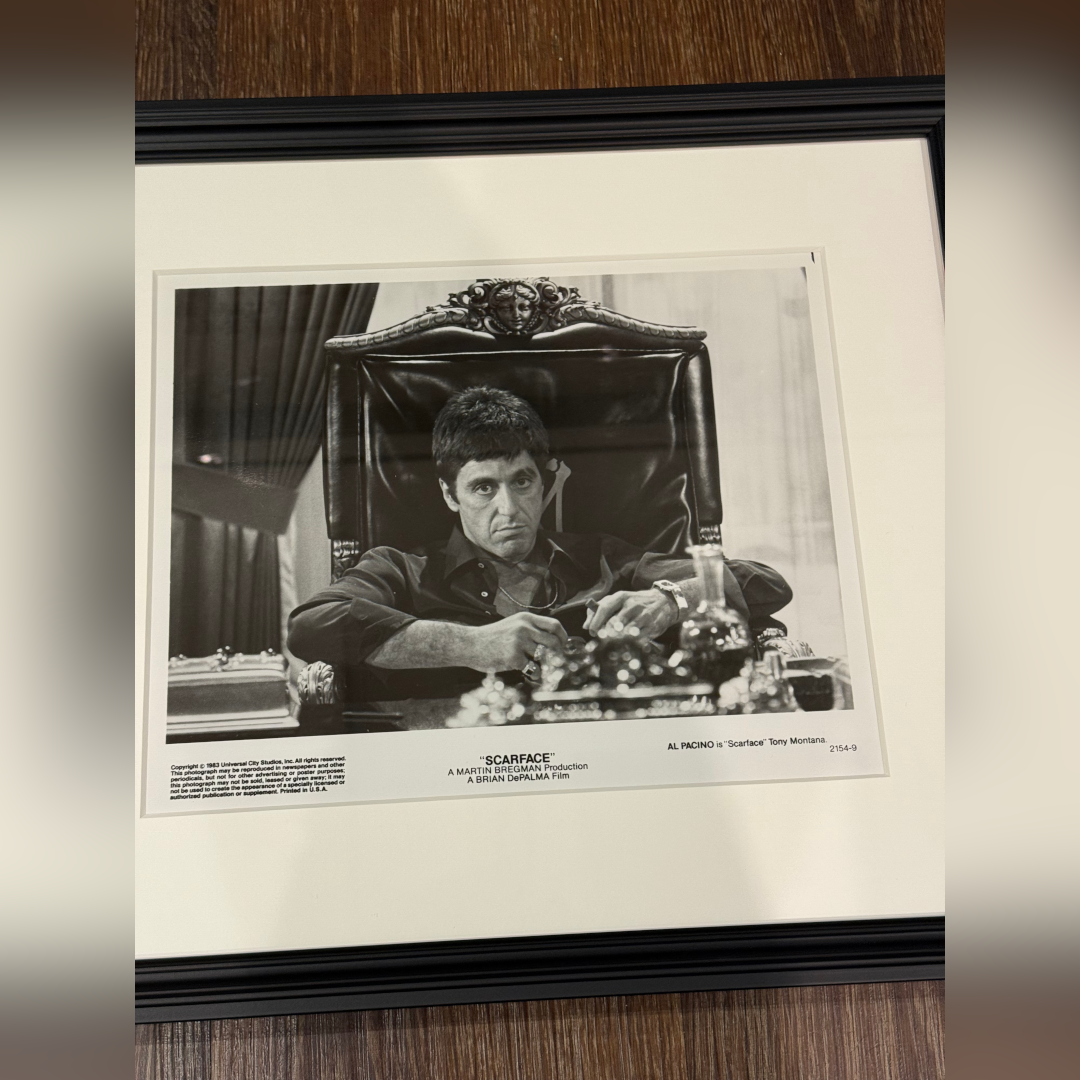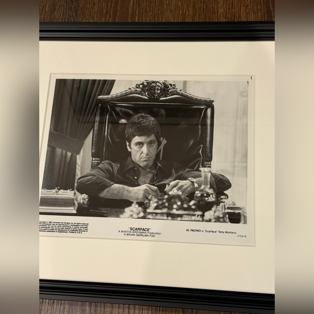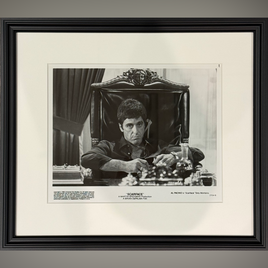 Powerful black & white still featuring Al Pacino as Tony Montana at his desk, one of cinema’s most unforgettable images of excess, ambition, and downfall.