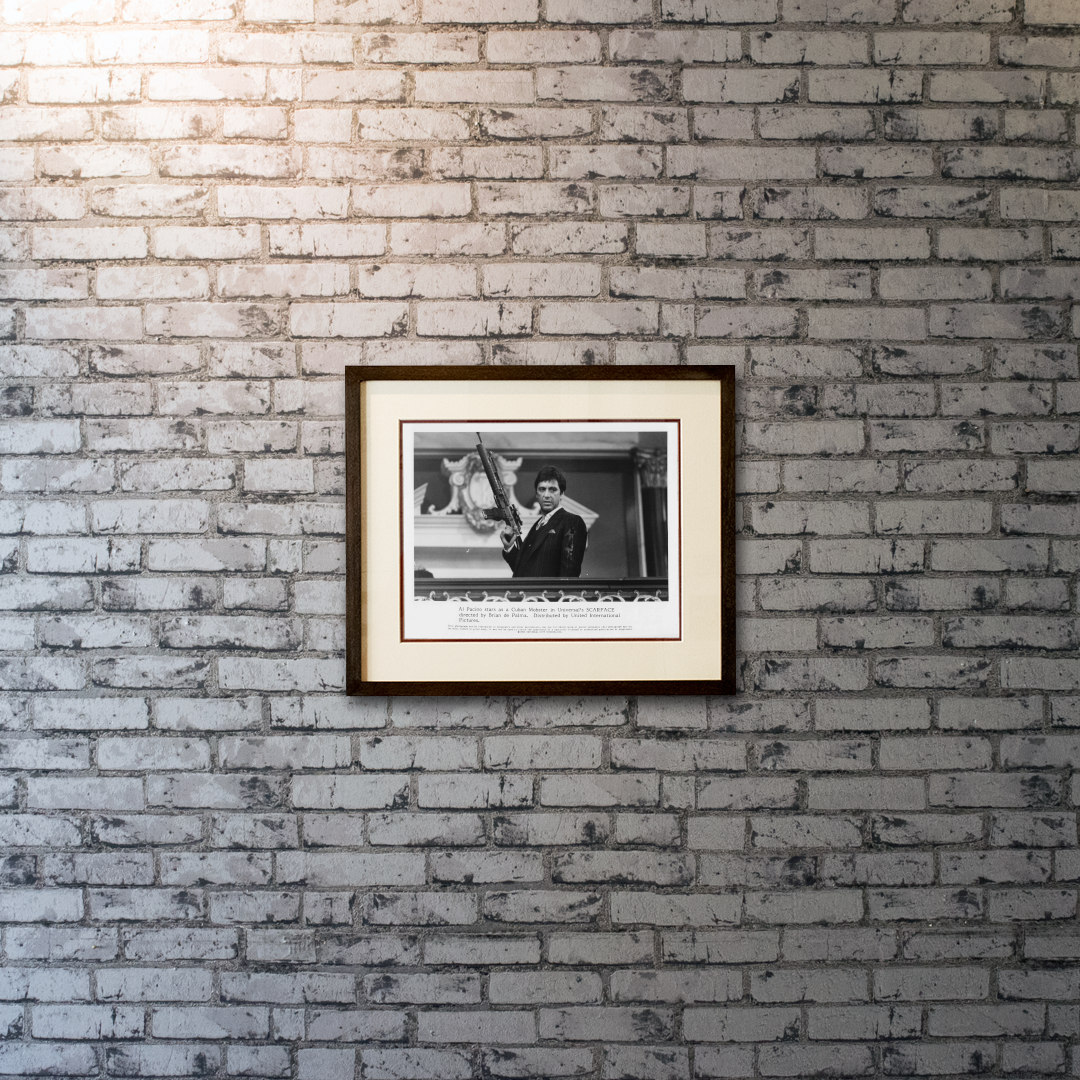 An electrifying original still from Brian De Palma’s Scarface (1983), featuring Al Pacino in his defining role as Tony Montana. Captured mid-climax, Montana stands on the grand staircase of his mansion, weapon raised, moments before the infamous “Say hello to my little friend!” sequence — one of the most iconic scenes in film history!