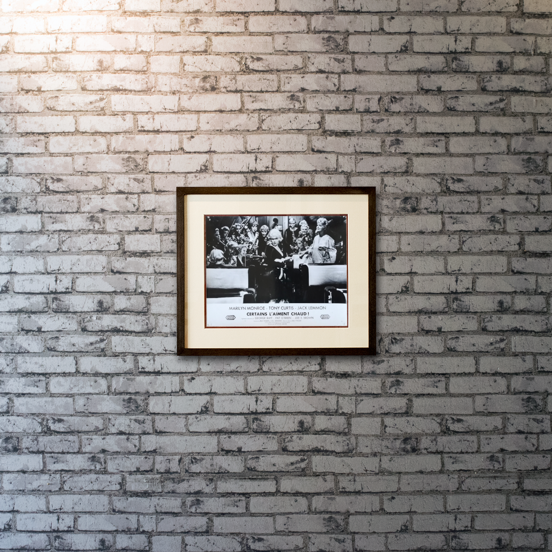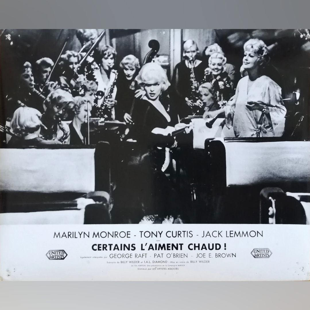 A wonderful vintage French lobby card for Some Like It Hot (1959), featuring Marilyn Monroe as Sugar Kane performing with the all-female band, while Jack Lemmon (in drag as Daphne) looks on. This lively image captures the film’s playful energy and the charm that made Monroe, Lemmon, and Tony Curtis such an unforgettable trio.
