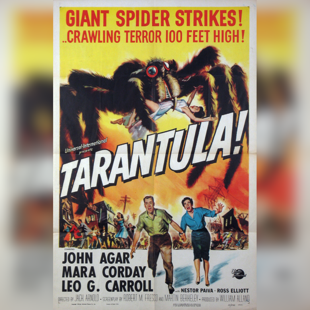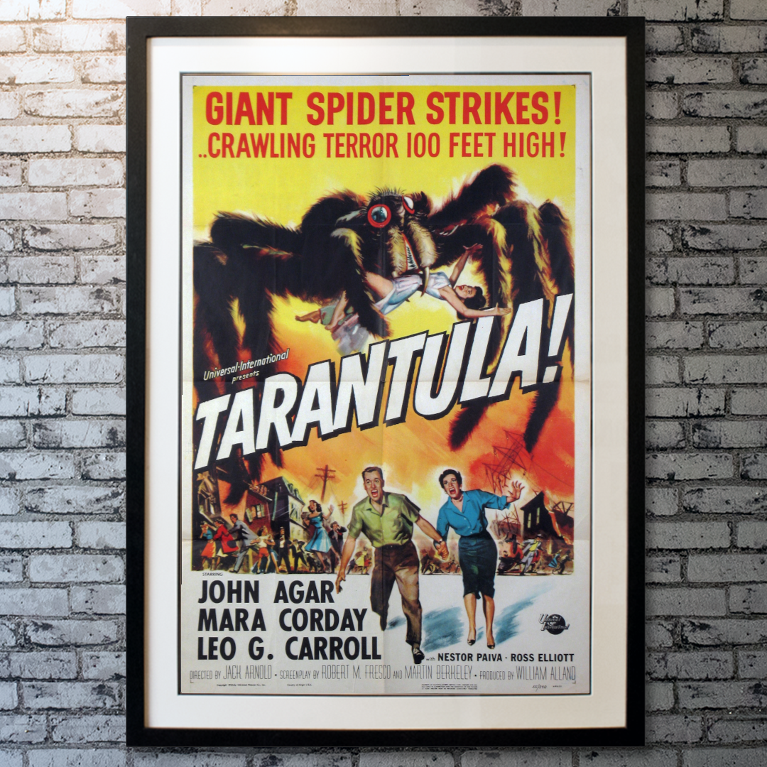 An electrifying 1955 original US One Sheet for Tarantula!, Universal International’s cult classic monster thriller. Illustrated by Reynold Brown, one of the era’s greatest movie poster artists, this stunning artwork features a gigantic mutant spider terrorising a desert town while frantic citizens flee in chaos — the perfect visual embodiment of 1950s atomic-age fear and sci-fi spectacle.
