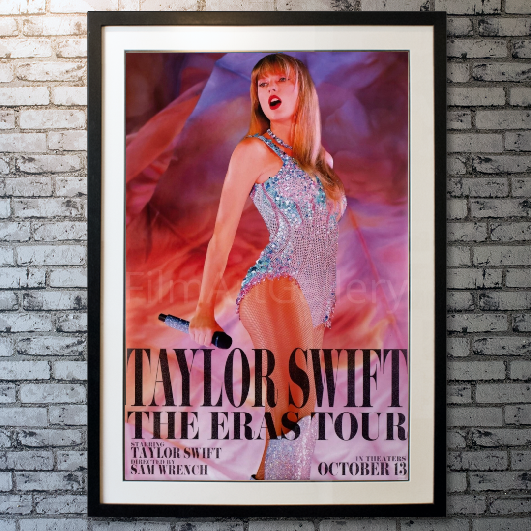 An original double-sided theatrical poster for Taylor Swift: The Eras Tour (2023), directed by Sam Wrench. This striking image captures Taylor Swift in one of her glittering custom-designed tour outfits, microphone in hand, bathed in vibrant pink and lilac hues. The design radiates the energy and spectacle of The Eras Tour, a concert experience that celebrated every musical “era” of Swift’s extraordinary career. Printed in limited quantities for cinema display, this is a highly collectible piece for Swift fans and modern music enthusiasts alike.