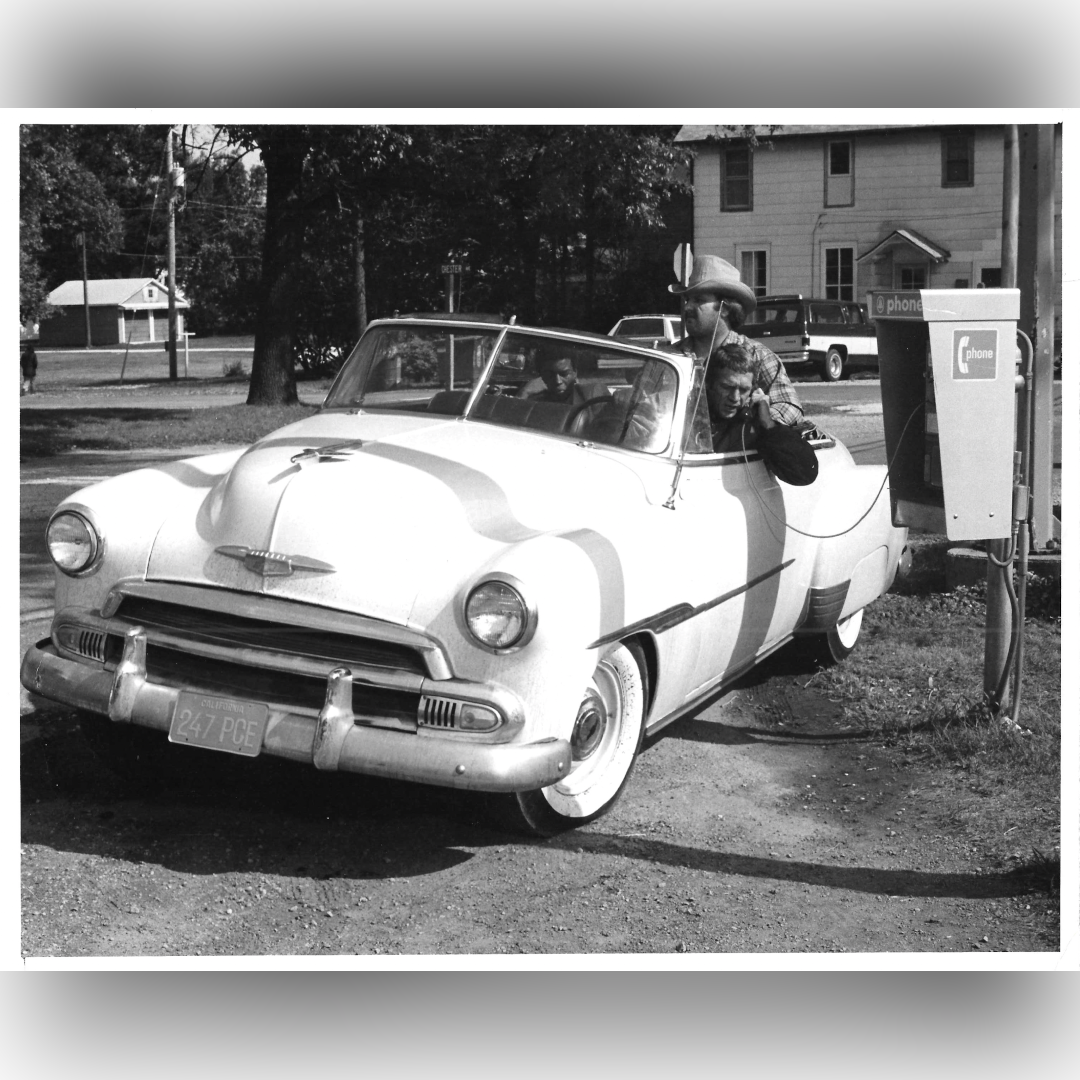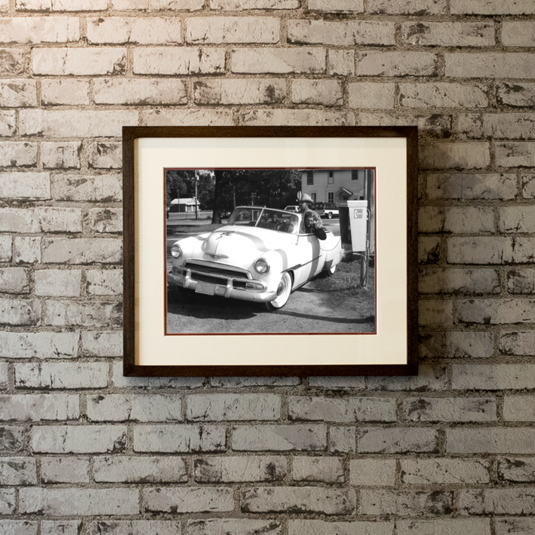 Original 1970 black-and-white Publicity Still. Steve McQueen driving a 1950s-era Chevrolet convertible at a gas station. An everyday slice of small-town America imbued with quiet tension. His relaxed posture and alert expression hint at the simmering energy that would soon define his on-screen persona. This still is emblematic of late-1950s American cinema, where teenage rebellion, drive-in culture, and Cold War unease subtly intersected.
