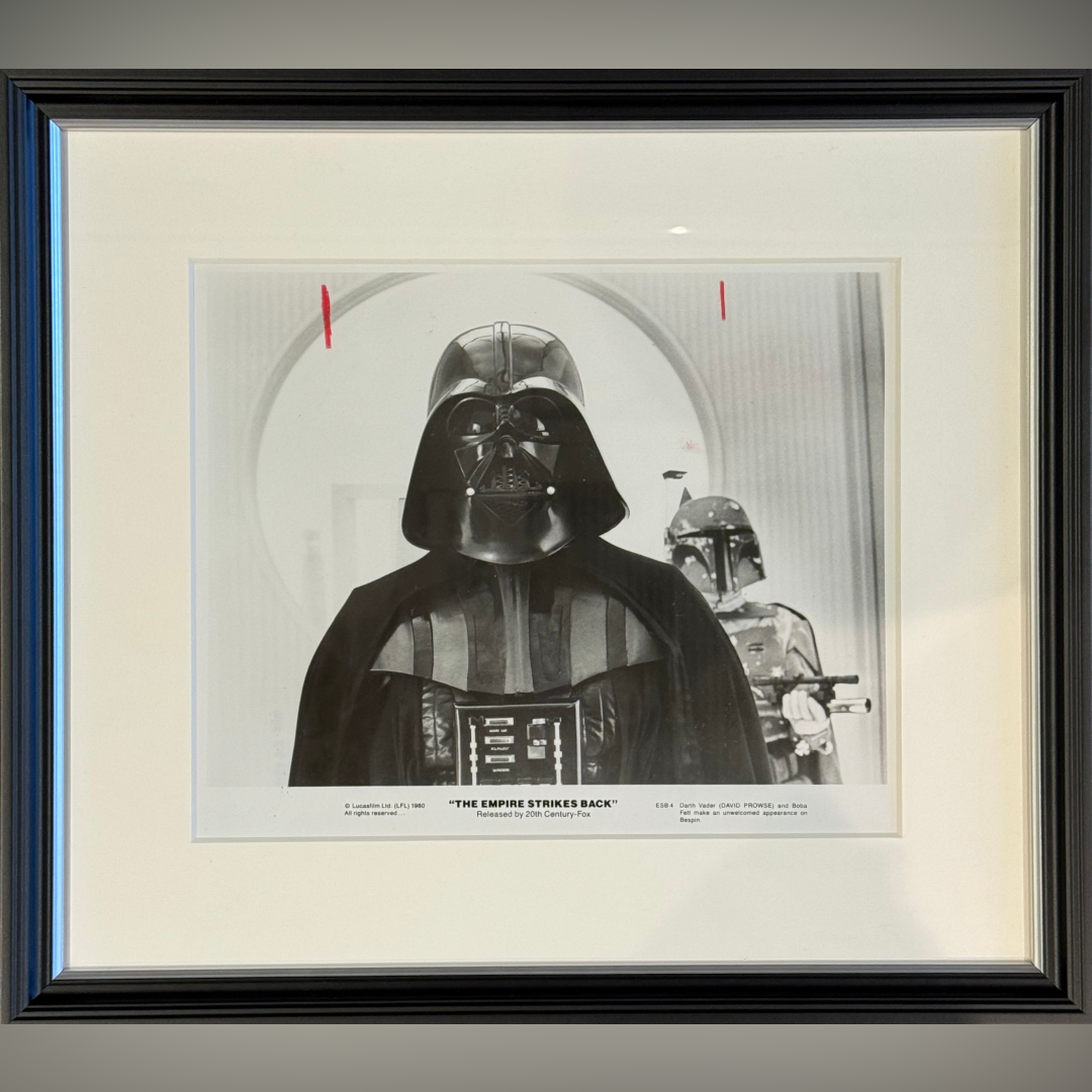 A powerful production still featuring Darth Vader (portrayed physically by David Prowse) flanked by the instantly recognisable bounty hunter Boba Fett, making an unmistakably unwelcome entrance. Shot in crisp black and white, this image captures the chilling authority of Vader at the height of his power, backed by one of the saga’s most iconic villains.