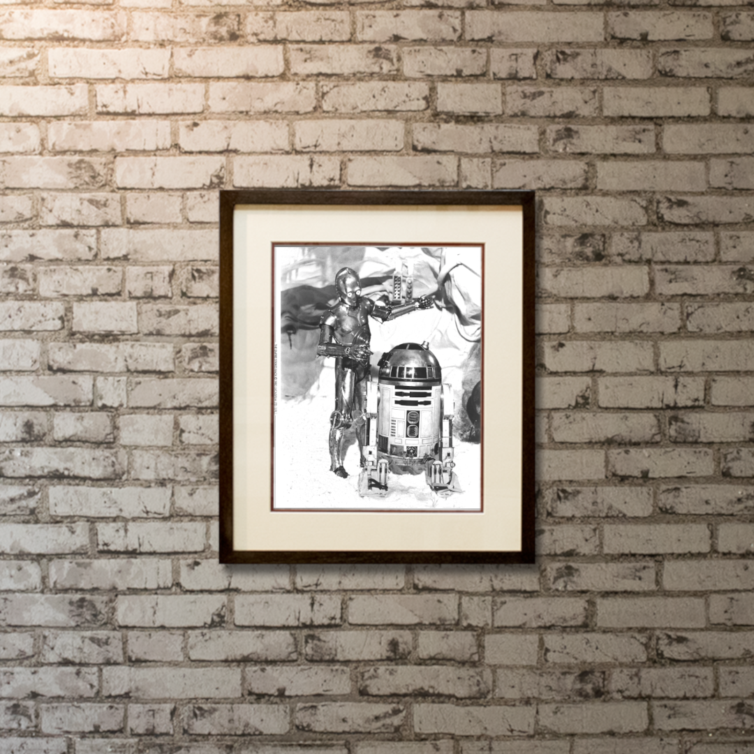 The Empire Strikes Back (1980), featuring the saga’s most beloved droids in a moment of quiet camaraderie. The image captures C-3PO and R2-D2 standing amid the icy environment of Hoth, their contrasting forms: a tall, polished protocol droid and a compact, battle-worn astromech, creating a visual shorthand for the series’ blend of humour, heart, and adventure. C-3PO’s tentative gesture toward R2-D2 reads as both anxious and friendly.