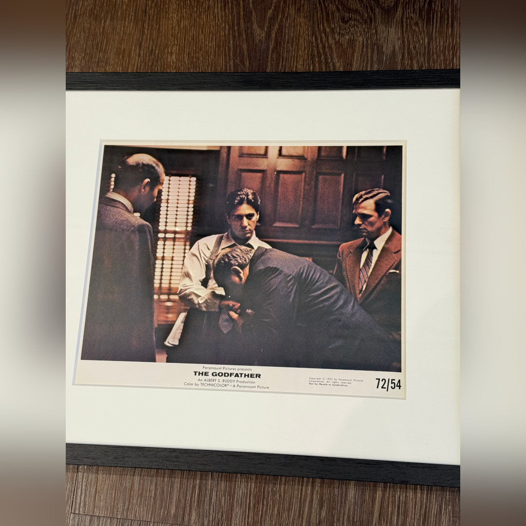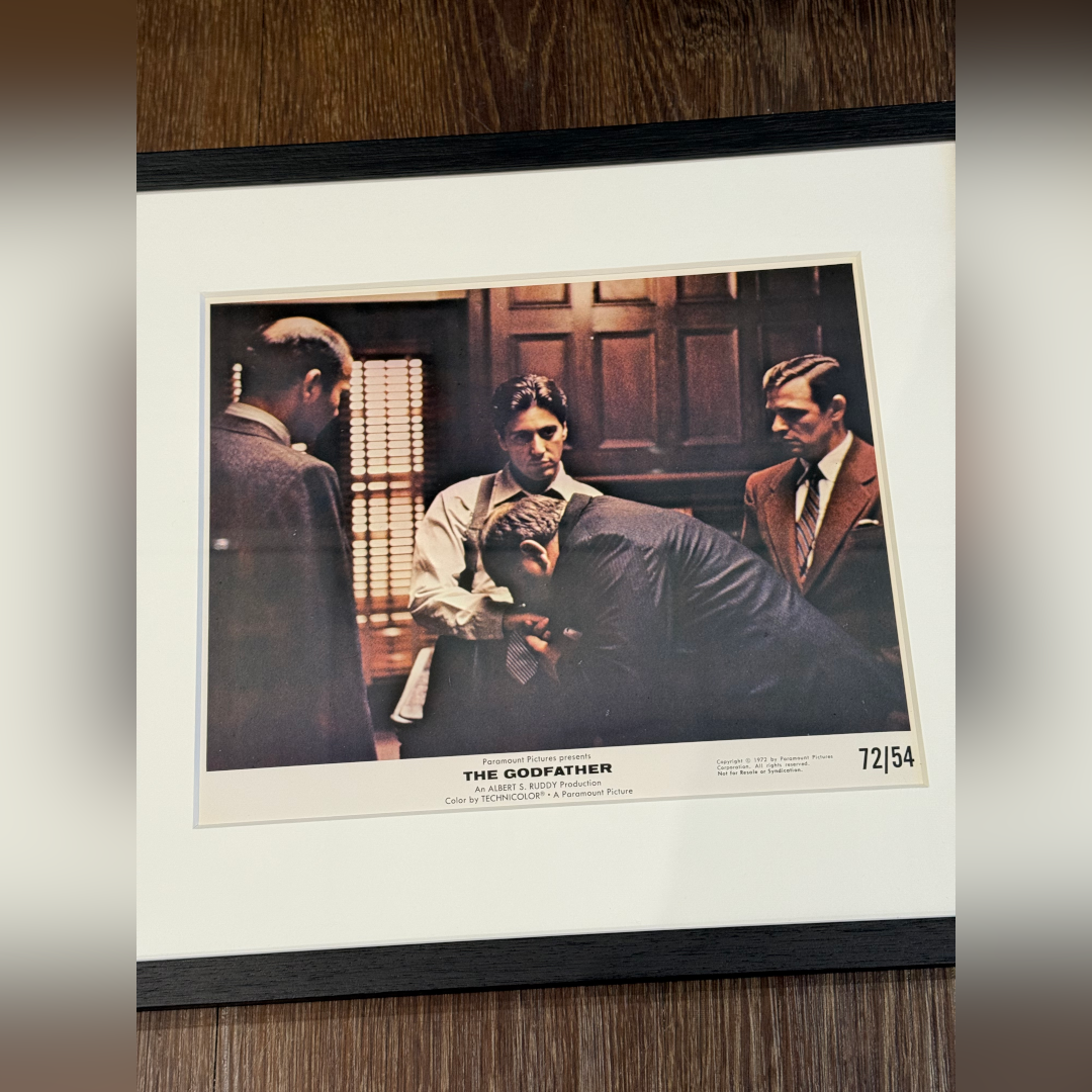 An original 1972 mini lobby card from Francis Ford Coppola’s The Godfather, showing Al Pacino as Michael Corleone in a defining moment of transformation, calm, calculating, and fully assuming the role of Don. The scene captures a subordinate bowing to kiss Michael’s hand, symbolising the transfer of power and the solidification of his control over the Corleone empire. The subdued palette and chiaroscuro lighting, a hallmark of cinematographer Gordon Willis, heighten the sense of quiet menace and authority.