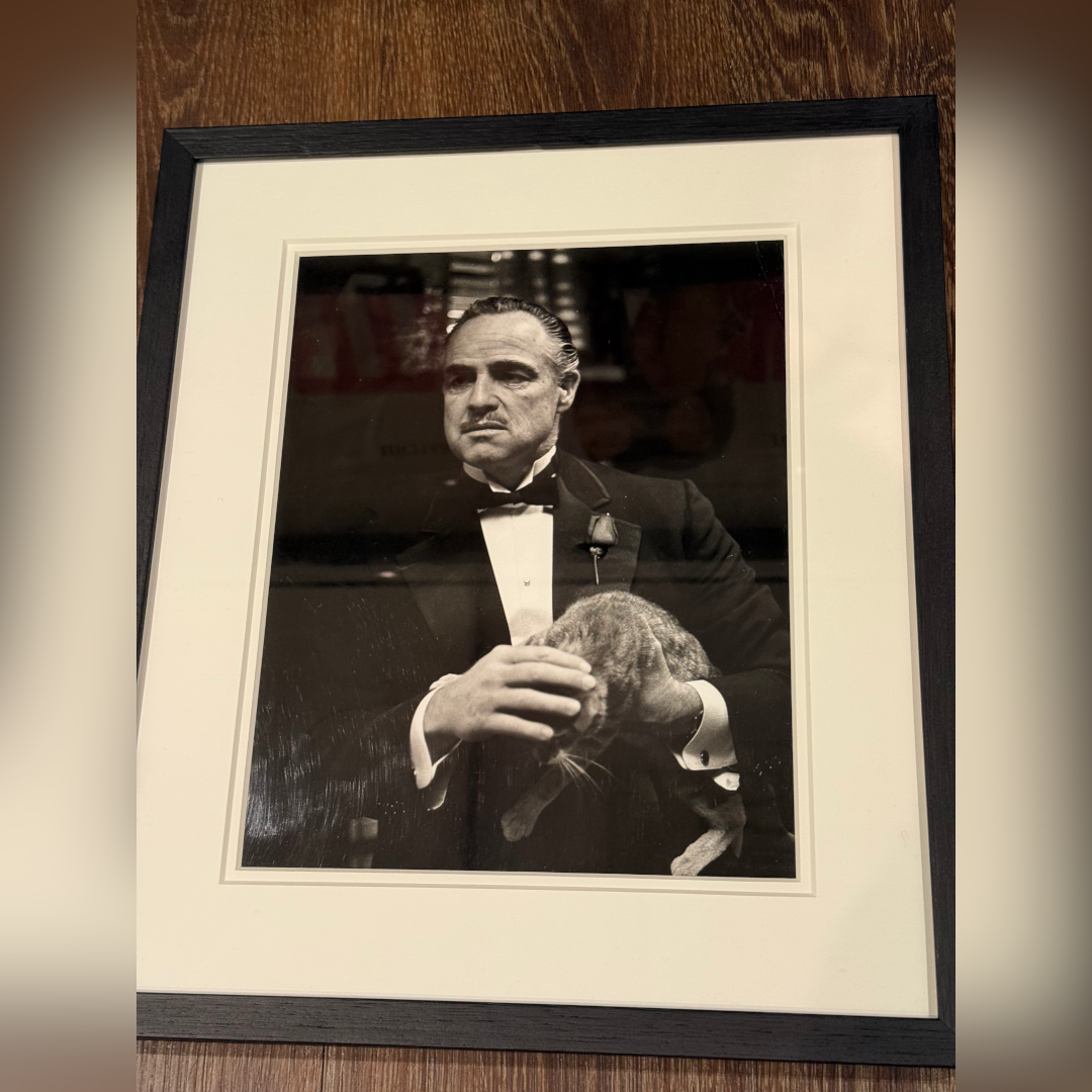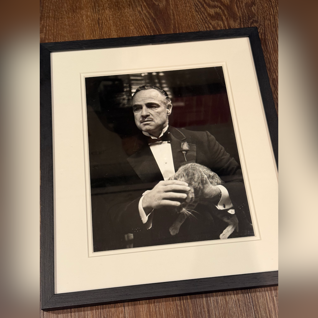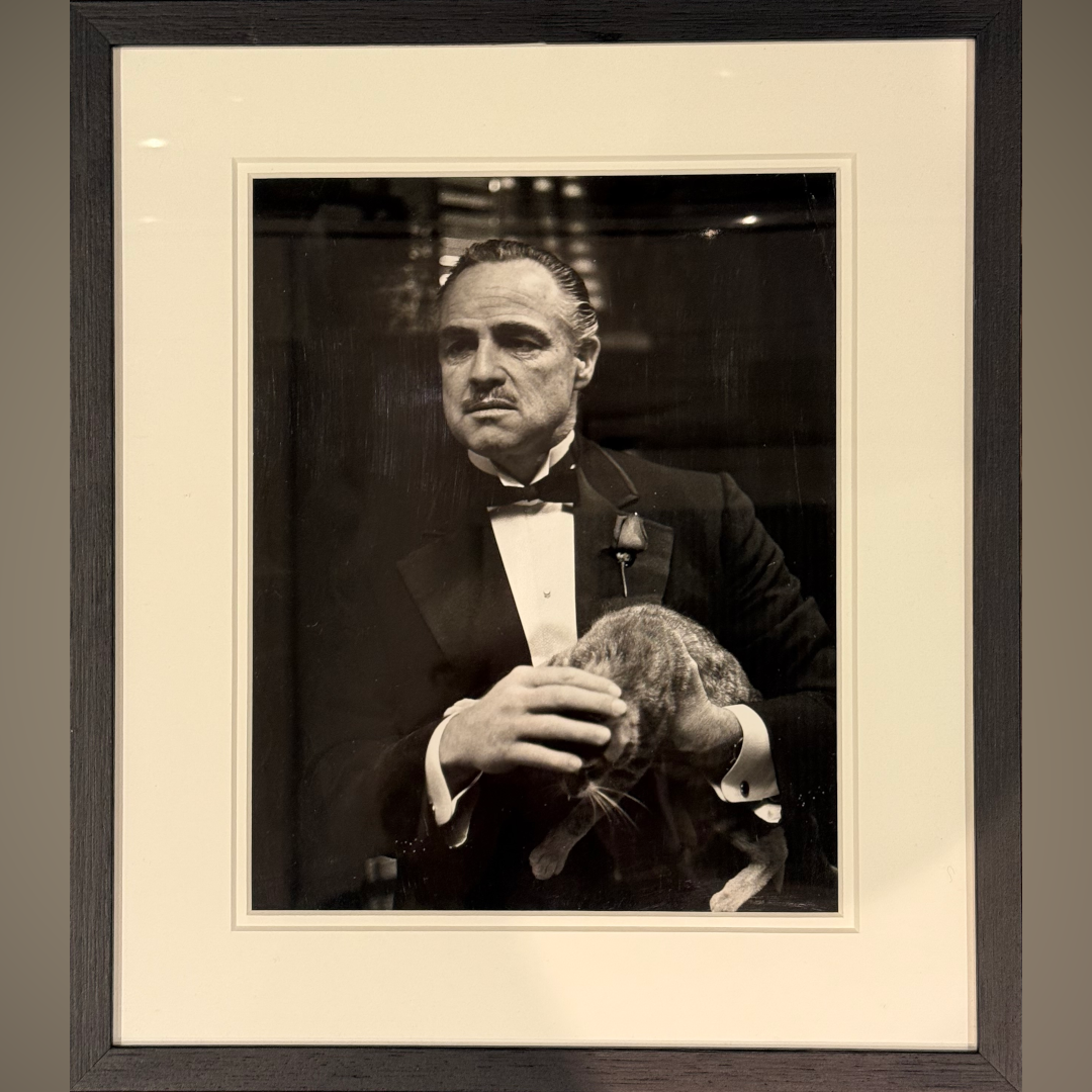An extraordinarily rare, original black & white still capturing one of cinema’s most famous images, Marlon Brando as Don Vito Corleone, quietly stroking a cat in the opening scene of The Godfather. This unscripted moment, with the cat famously wandering onto set, became an instant symbol of Brando’s calm yet terrifying power, and one of the most recognisable images in film history. The back of the still bears its original vintage studio stamp code (5042 14), confirming its provenance. Conservation framed with UV plexiglass.