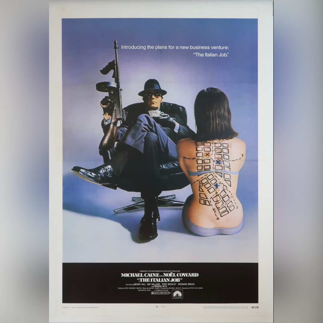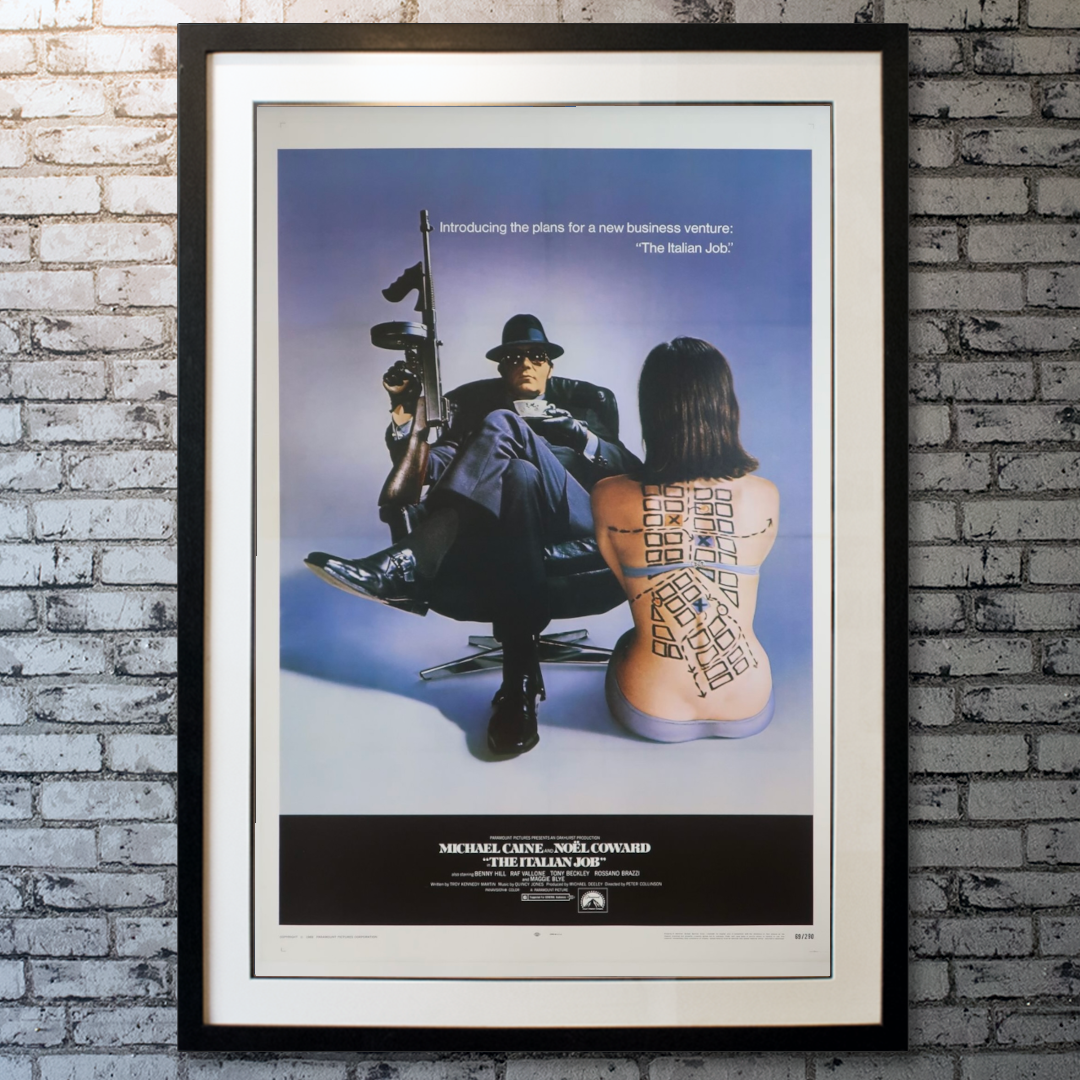 An original 1969 first release US One Sheet poster for the cult British caper The Italian Job, starring Michael Caine, Noël Coward, and Benny Hill. The stylish artwork features a mobster figure seated with a tommy gun while the back of a woman is used as a map for the heist, a perfect reflection of the film’s mix of crime, comedy, and Swinging Sixties cool.