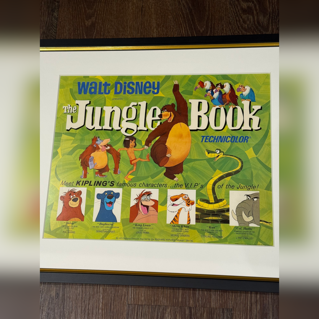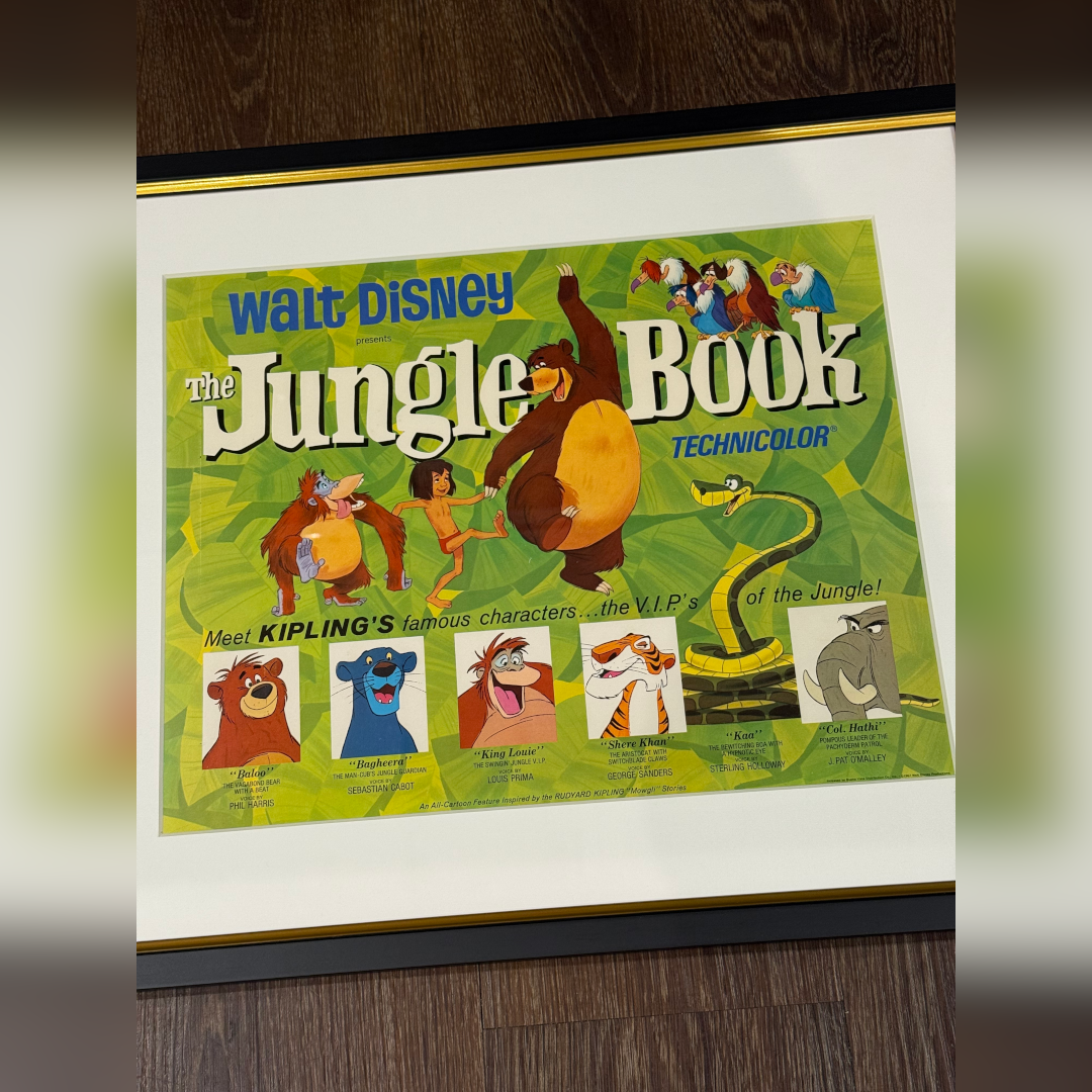 An original 1967 U.S. Title Card from Walt Disney’s The Jungle Book, featuring the film’s most beloved characters — Baloo, Bagheera, King Louie, Shere Khan, Kaa, and Colonel Hathi, presented in bold, joyful Technicolor. This beautifull lobby card captures the playful energy and warmth that made the film a global sensation.