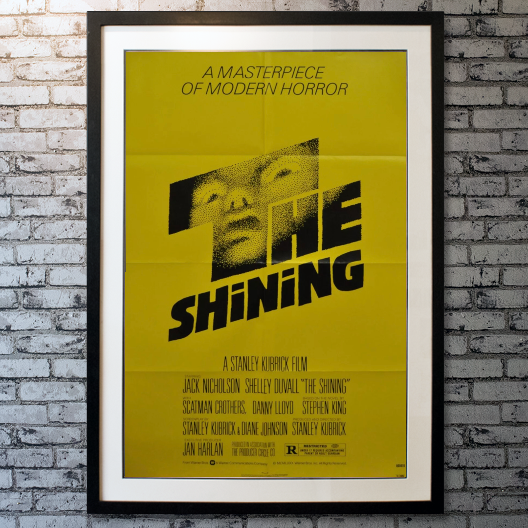 This is the rarer National Screen Service (NSS) style US one sheet for Stanley Kubrick’s The Shining, a film that redefined psychological horror. A masterpiece of modern horror. The stark yellow design, with its unsettling halftone face, remains one of the boldest and most minimalist poster campaigns of the era. Instantly recognisable and highly coveted by collectors.